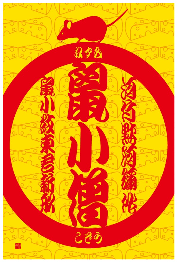 江戸時代後期に大名屋敷を専門に盗みを働いた盗賊鼠小僧次郎吉を主人公とした白浪物で、100日余も興行を続ける大当りをとった。回し車で遊ぶ“ねずみ”を鼠小僧に見立てました。背景はエメンタールチーズ(穴あきチーズ)柄になってます。