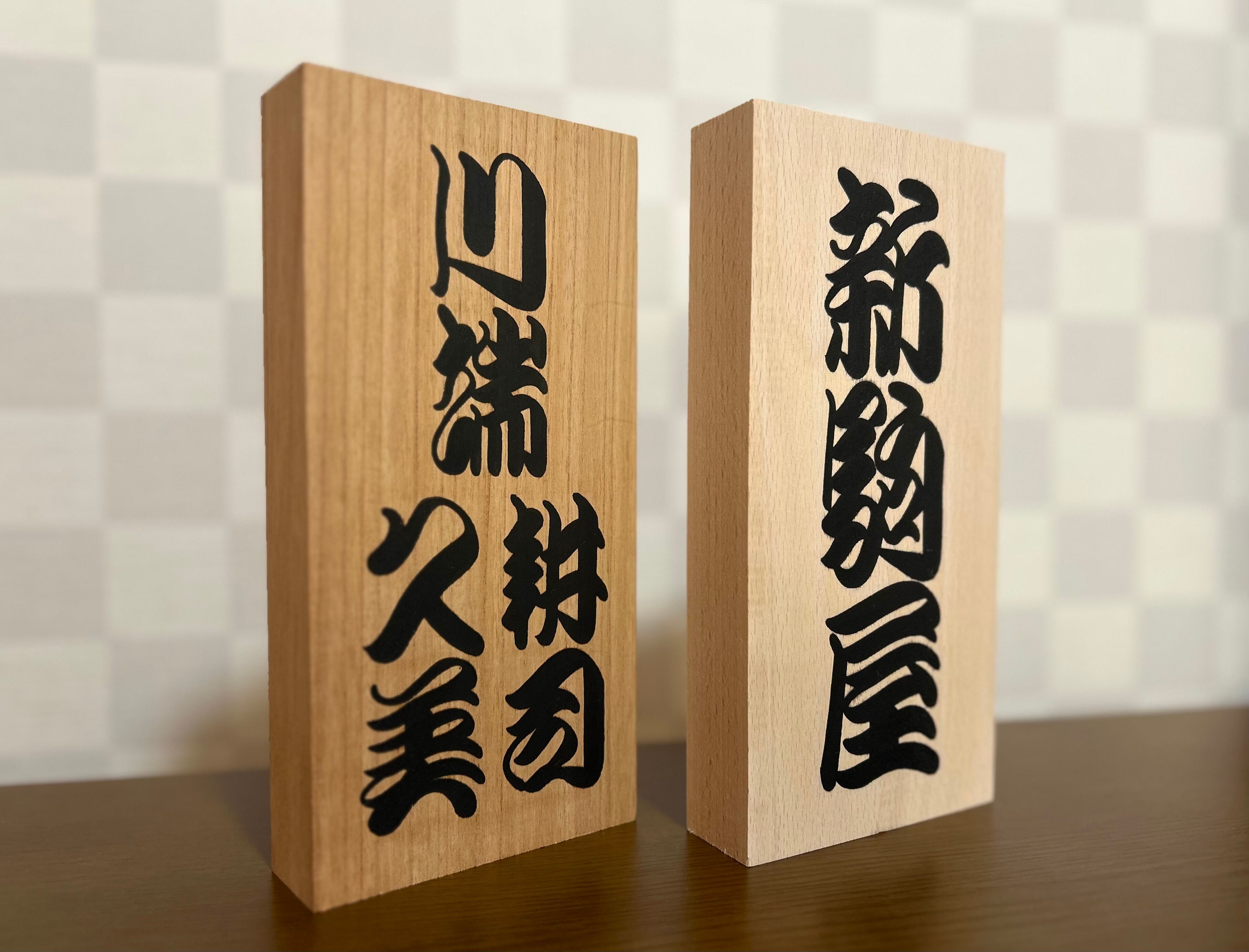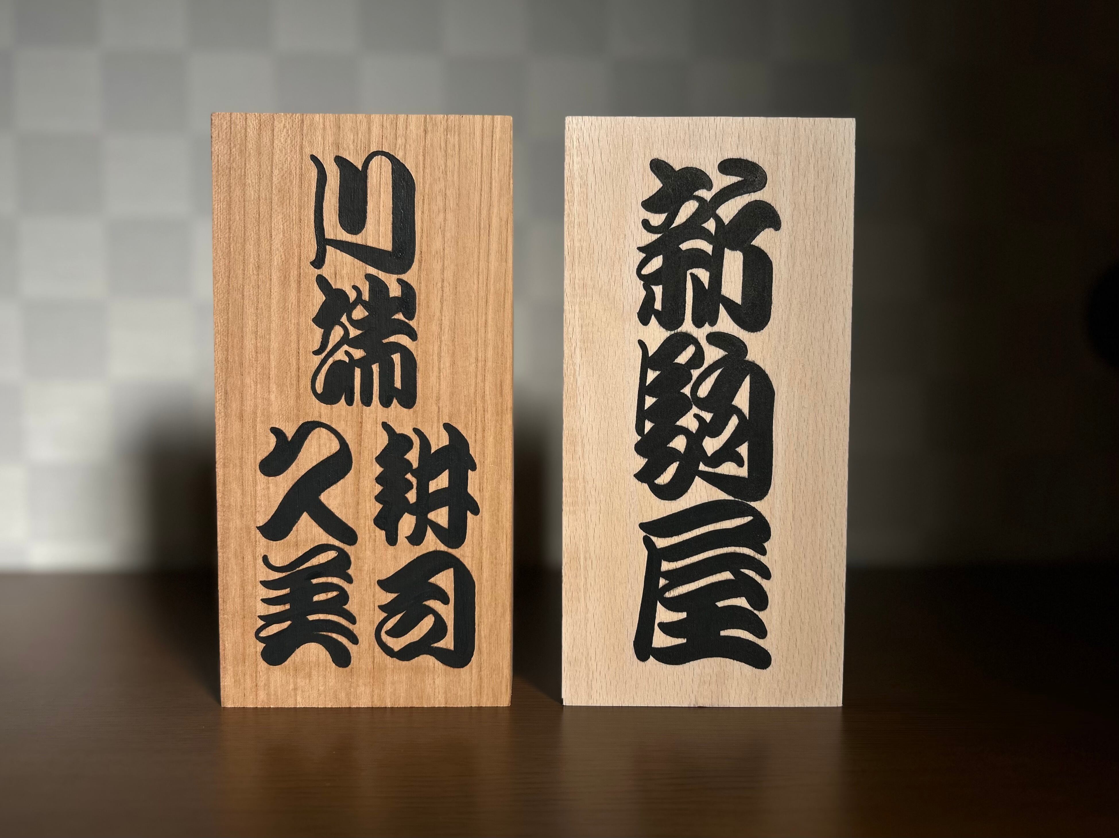 勘亭流での表札への名入れを承っております。※表札に対する防水又は撥水加工などは承っておりませんので、悪しからずご了承願います。(制作開始~商品のお渡しまで約三週間ほど頂戴いたします)